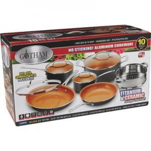Fry, steam, bake, roast, boil, and more in non-stick ceramic/titanium coated aluminum cookware. Safe for use with metalutensils and oven safe up to 500 degrees. Double riveted and contoured stainless steel handle. 10-piece set includes: 8.5 In. fry pan, 10.25 In. fry pan with lid, 1.5 Qt. pot with lid, 2.5 Qt. pot with lid, 5 Qt. pot with lid, and stainless steel steamer insert. PTFE (Polytetrafluoroethylene) /PFOA (Perfluorooctanoic acid) /PFOS (Perfluorooctanesulfonate) free. Dishwasher safe. Lifetime warranty.